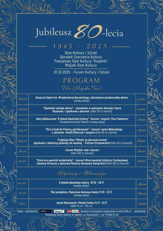 W sekretariacie Miejskiego Domu Kultury w Lubaniu można zakupić karnet na wszystkie wydarzenia biletowane w cenie 249 zł.
